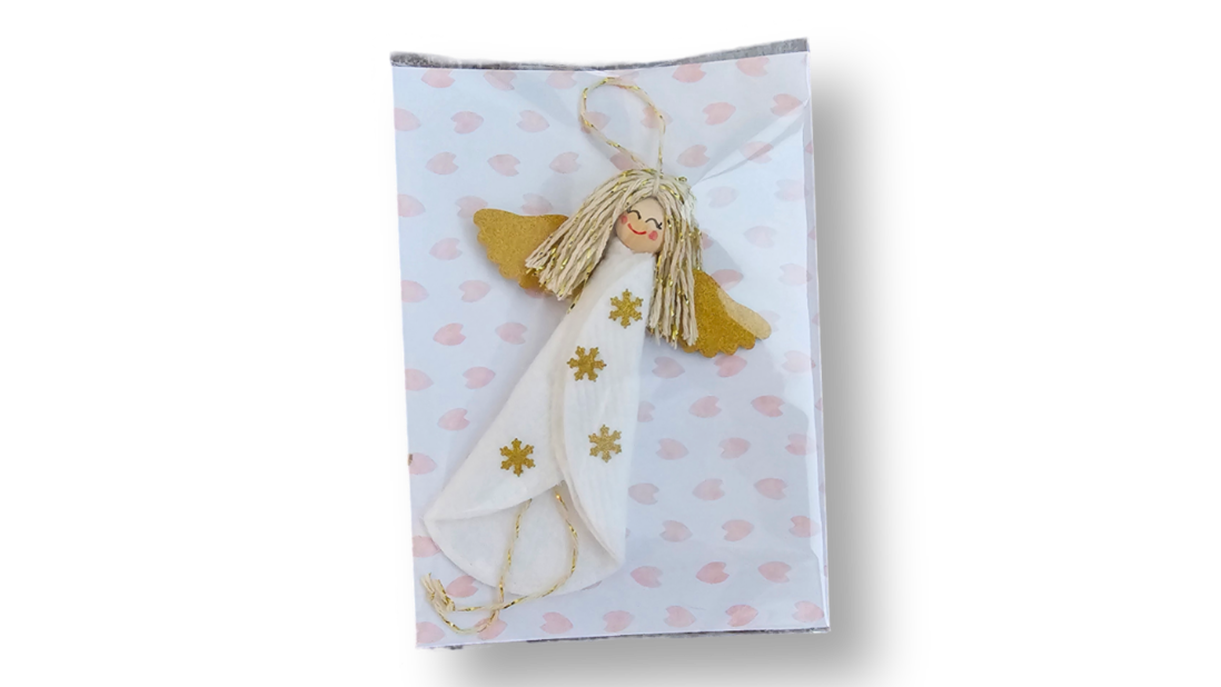 Ručně vyrobený andílek z vatového tamponu. Tento něžný andílek je zdobený drobnými srdíčky a jeho křídla se třpytí ve světle, což dodává dekoraci jemný a zářivý vzhled. Je to ideální doplněk na vánoční stromeček nebo jako součást sváteční výzdoby, který potěší oko i srdce. Vhodný i jako milý dárek pro vaše blízké.